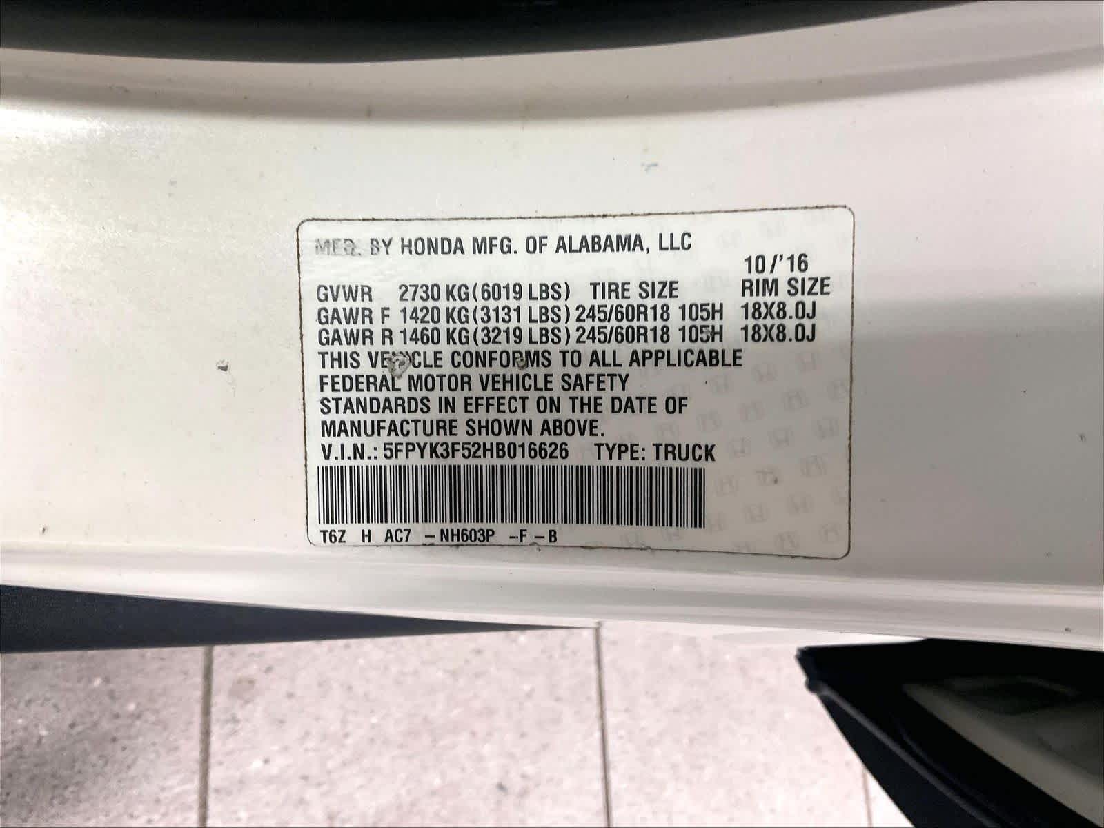 RTL | 51,940 milesStock # U1300112A | VIN # 5FPYK3F52HB016626